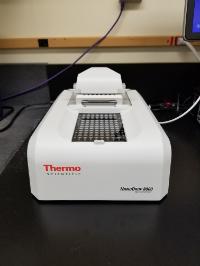 This instrument quantitates nucleic acid or protein in samples of 1.5-2 ul with the capability of measuring up to eight samples simultaneously. Sample quality data is the same as the Nanodrop 1000. When using an eight-channel pipette to dispense samples, 96 samples can be measured in less than six minutes.